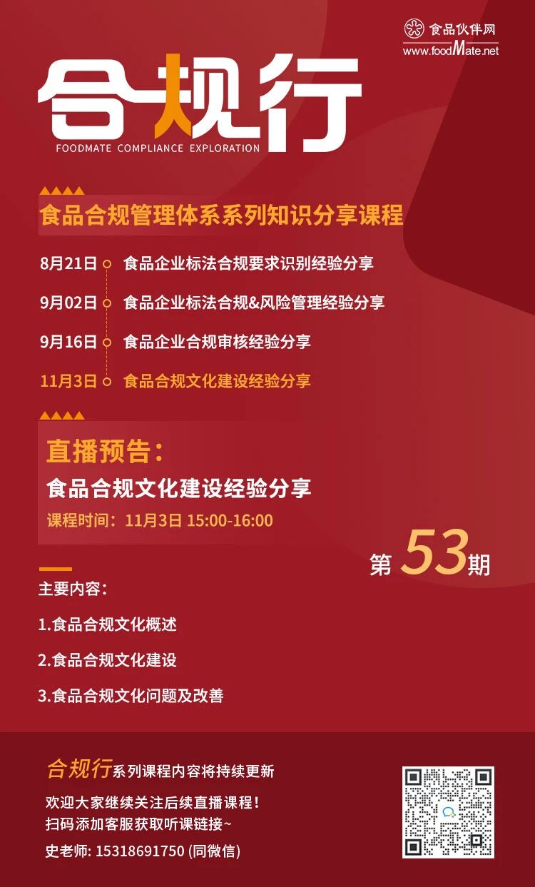 “合規行”系列公益直播課程由食品伙伴網食品安全合規服務事業部以“食學寶”為媒介平臺推出。針對目前食品企業普遍關注的話題,邀請行業內資深專家,從食品標準法規、合規管理、行業分析、熱點事件等主題進行實操講解,通過系列直播課程的分享幫助大家學習專業知識,規避食品安全合規風險,提高食品相關從業人員合規管理職業技能,助力企業合規發展。