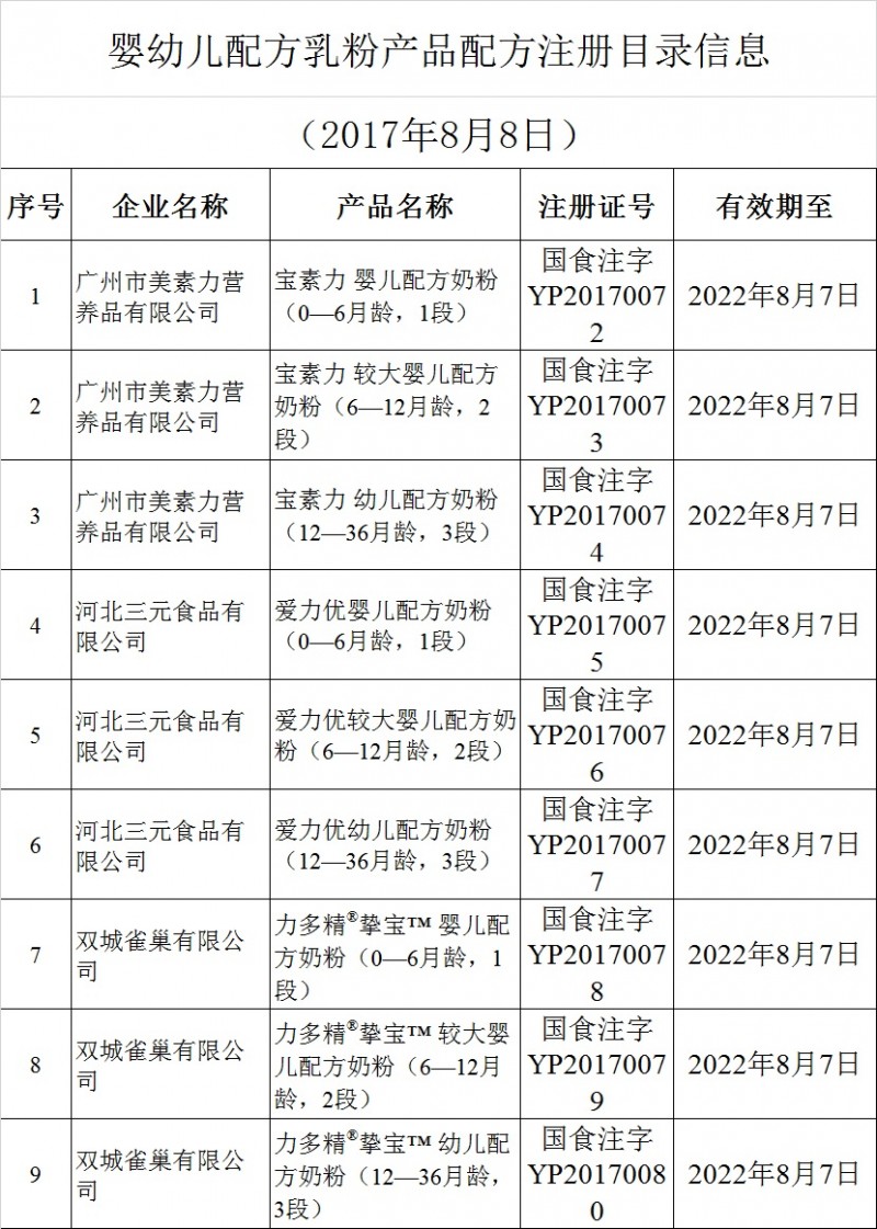 總局發(fā)布嬰幼兒配方乳粉產品配方注冊目錄信息(2017年8月8日)