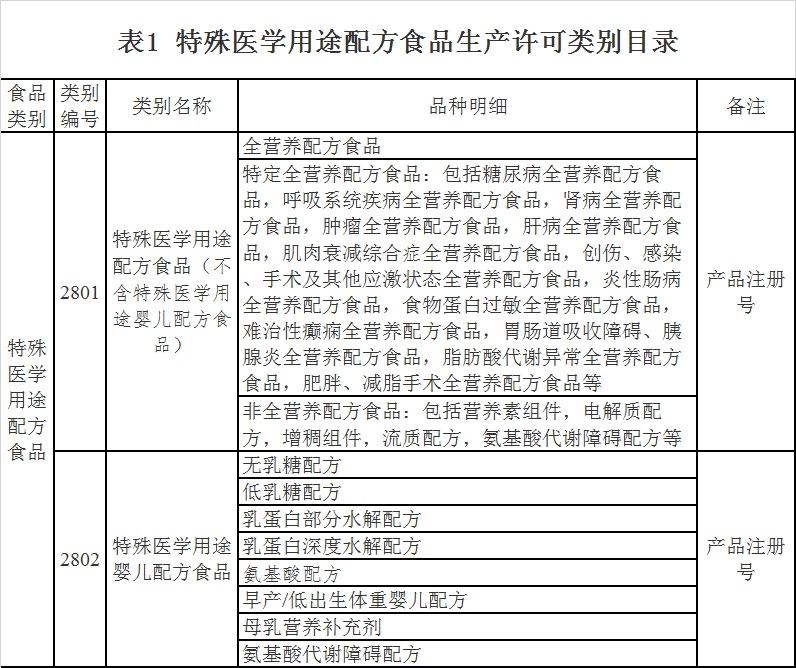 表1 特殊醫學用途配方食品生產許可類別目錄
