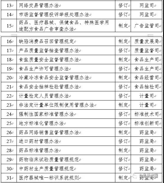 2.為加大藥品、疫苗和化妝品監(jiān)管力度,制定《藥品網(wǎng)絡(luò)銷售監(jiān)督管理辦法》《藥品標(biāo)準(zhǔn)管理辦法》《醫(yī)療器械唯一標(biāo)識系統(tǒng)規(guī)則》《進(jìn)口醫(yī)療器械代理人監(jiān)督管理辦法》,修訂《進(jìn)口藥材管理辦法》《藥物臨床試驗質(zhì)量管理規(guī)范》《中藥材生產(chǎn)質(zhì)量管理規(guī)范》;推進(jìn)《藥品流通監(jiān)督管理辦法》《藥品生產(chǎn)監(jiān)督管理辦法》《藥品醫(yī)療器械檢查辦法》《化妝品注冊備案管理辦法》《化妝品標(biāo)簽管理辦法》《化妝品生產(chǎn)監(jiān)督管理辦法》的制修訂。(藥監(jiān)局起草)