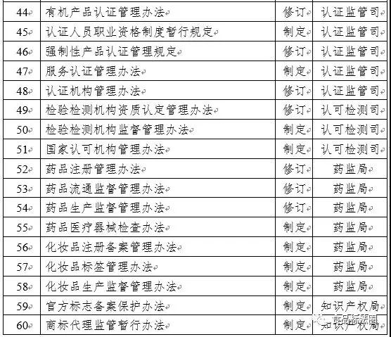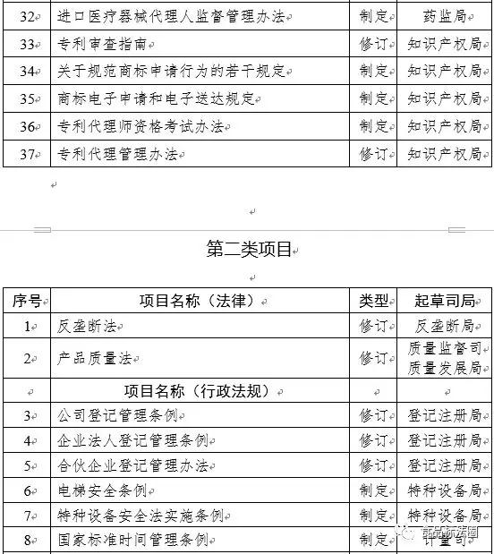 (六)加強立法協(xié)調(diào),推動總局已報送的法律、行政法規(guī)草案順利出臺。積極配合立法機關(guān),推動計量法、疫苗管理法、藥品管理法、專利法和消費者權(quán)益保護(hù)法實施條例、企業(yè)名稱登記管理條例、個體工商戶條例、食品安全法實施條例、醫(yī)療器械監(jiān)督管理條例、化妝品監(jiān)督管理條例等已報送審查或提請審議的法律、行政法規(guī)草案制修訂出臺。配合立法機關(guān)做好機構(gòu)改革和“放管服”改革等專項法律法規(guī)清理工作。