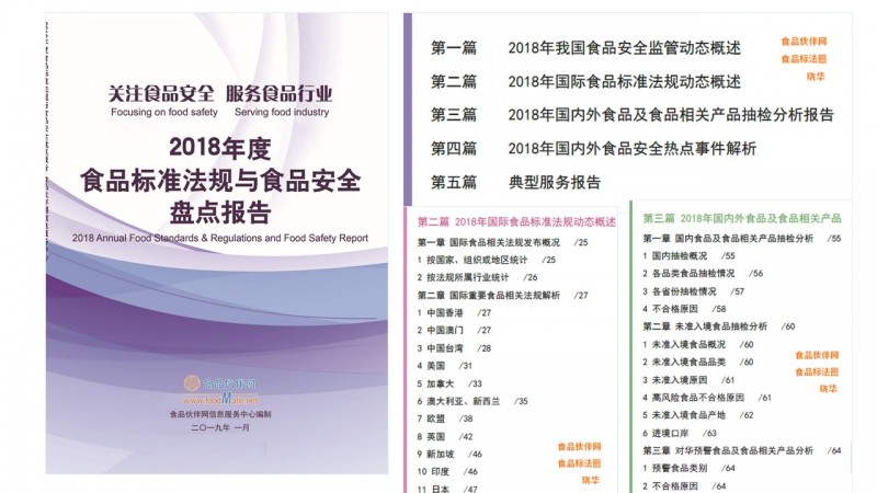 食品伙伴網信息服務事業部盤點2018年食品安全、標準法規行業“大事記”,系統梳理2018年發生的食品安全熱點事件、食品行業標準法規變化,幫助從業者更加系統、直觀的了解行業變化。《2018年食品標準法規與食品安全盤點報告》、《食品標法圈期刊 第六期》、《2018中國食品行業安全發展報告》三本書籍(詳情見附圖),縱觀食品行業風卷云涌,因勢而動,蓄勢待發!你值得擁有!