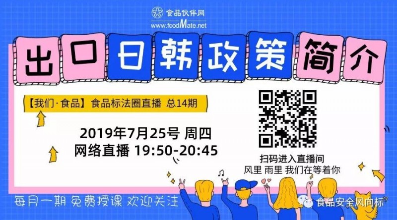 為能使企業朋友深入交流食品相關標準法規修訂進展,分享新法規體系下更新要點解讀和應對方案,為企業答疑解惑。食品伙伴網信息服務事業部推出【我們·食品】系列課程,涵蓋線上課堂和線下課堂。線上課堂-直播課程,4月開播后陸續進行了【食品標準基礎知識】、【食品法規基本知識】等主題的直播課,吸引了來自全國各地網友的關注。本期線上課程,旨在幫助企業人員學習日韓食品相關監管法規等知識。