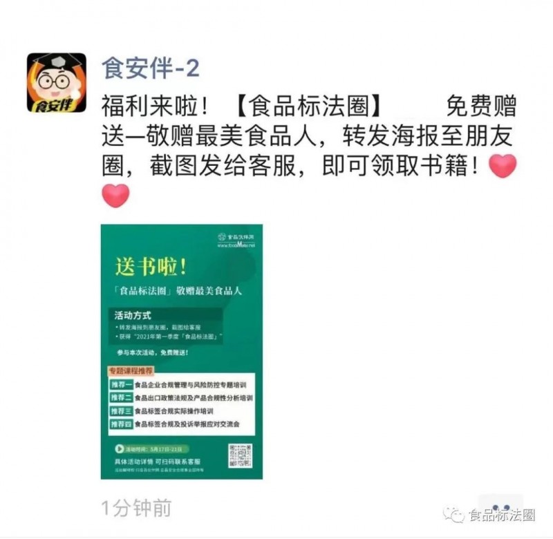 添加小編微信-朋友圈轉(zhuǎn)發(fā)海報-截圖發(fā)給小編-獲取二維碼填寫郵寄信息-獲得"食品標法圈"